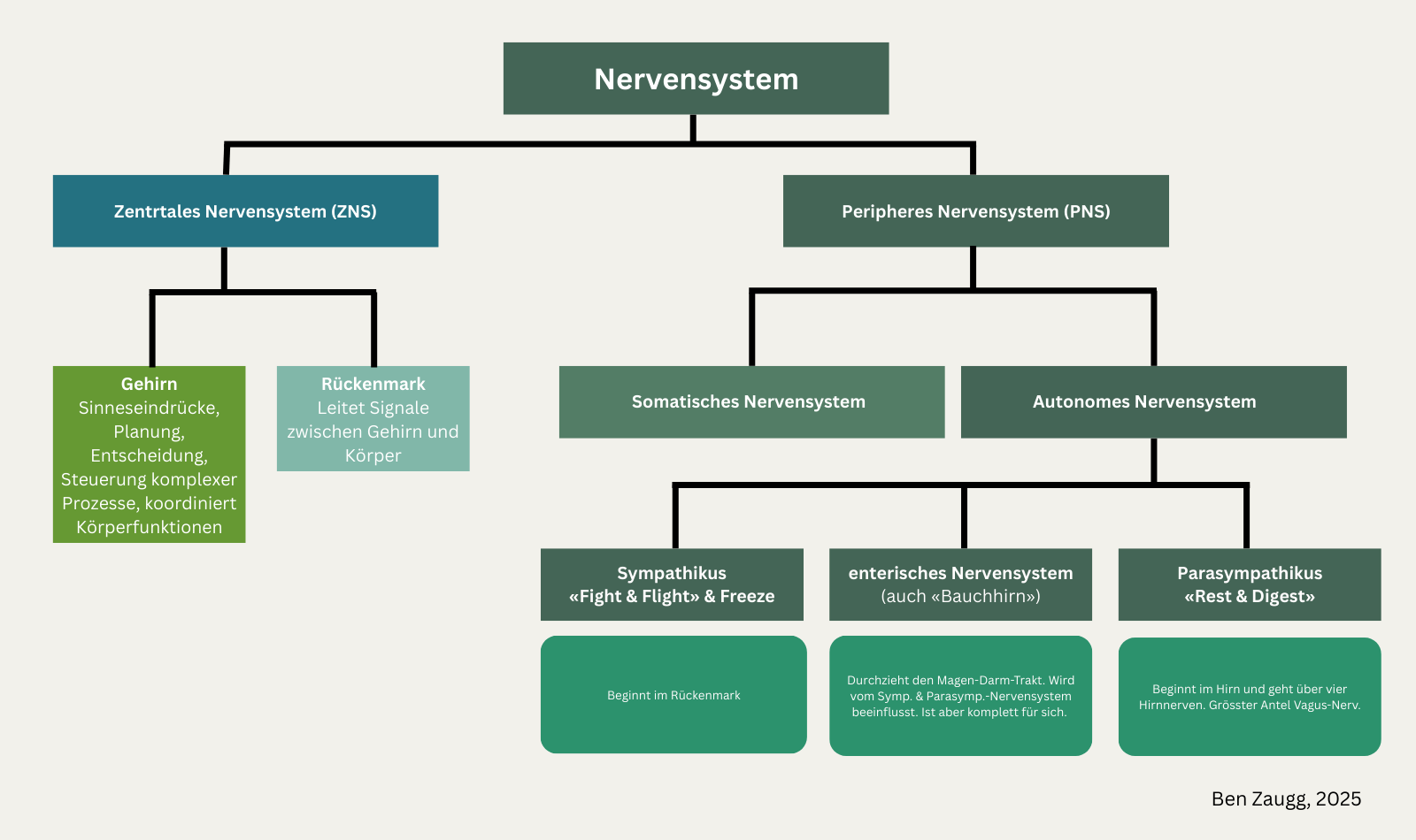 - Vegetatives / autonomes Nervensystem: unbewusste Steuerung lebenswichtiger Funktionen wie Herzschlag, Atmung, Verdauung